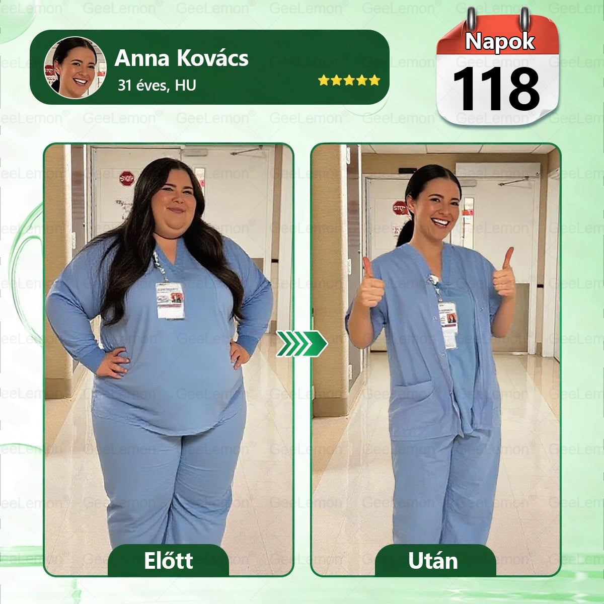 Két hónap elteltével visszatért az energiám. Újra elkezdtem esti sétákra járni. Négy hónappal később — 170 fonttal kevesebb, a súlyom 117 fontra csökkent. A bőröm nem lett megereszkedett és laza, ahogy ilyen gyors fogyásnál várható lenne. Nagyon elégedett vagyok azzal, milyen feszes maradt minden. Továbbra is ápolónőként dolgozom, de most már magamra is figyelek. A túlsúllyal küzdő pácienseimnek mindig azt mondom: soha nem késő visszaszerezni az egészséget.”— Anna Kovács, 31 éves, Magyarország